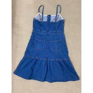 Madewell womens bayview blue denim sleeveless tank knee length western button front adjustable straps unlined cowgirl dress in size 4. The fabric tag has been removed but is a cotton blend when compared with others. All measurements are taken laying flat and approximate.