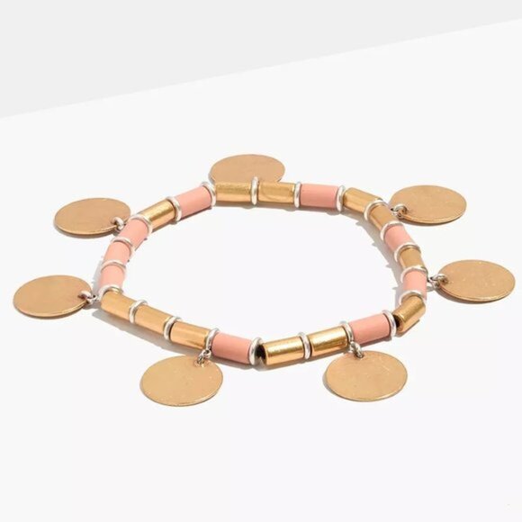 A swingy, stretchy bracelet that combines smooth discs with sleek mixed metal beads. Stacks well with others.