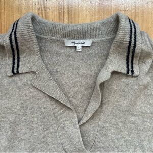 Cozy beige sweater with navy trim. Features a stylish collar. Perfect for casual wear.