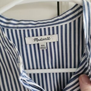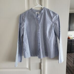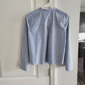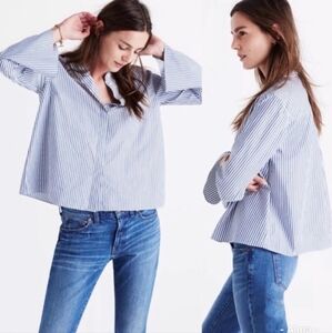 Concealed front button placket & gradual flare to bottom hem. Bell sleeves.