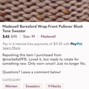 Madewell Beresford wrap front pullover wool blend sweater. Ballet/powder/petal pink toned.slight balloon sleeves. Size Large.