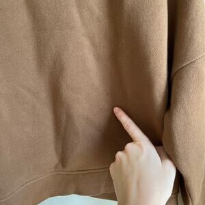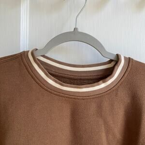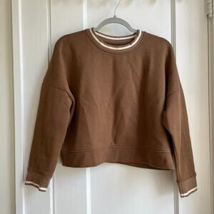 Comfy cropped brown sweatshirt from Madewell with striped collar and cuffs. Weathered walnut colorway. Women's size small. Two small spots on the front (see photo). Otherwise excellent used condition!