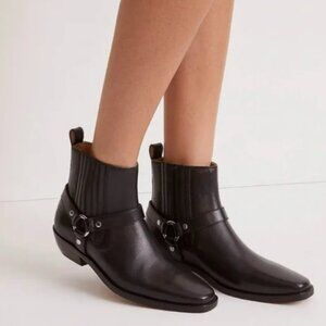 Sleek black leather ankle boots. Features buckle detail and low heel. Perfect for versatile styling.
