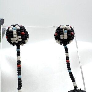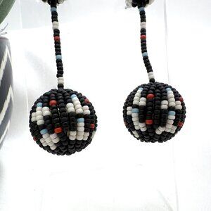 - Beaded Southwest design of black, red, white, and blue seed beads on a dangling drop ball