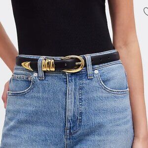 Crafted from smooth black leather, this Madewell belt showcases a timeless design with a gold-toned buckle, perfect for elevating any outfit. Its adjustable fit ensures comfort and versatility, making it an essential accessory for both casual and formal settings.