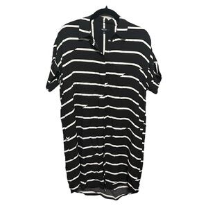 Madewell Black Break Stripe Button Front Courier Dress. Relaxed figure skimming fit. On-seam hip pockets. Button down front. Collared. Rolled short sleeves. Black and white stripe. Tunic shirt dress.