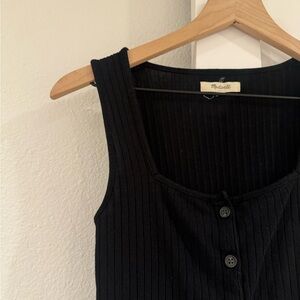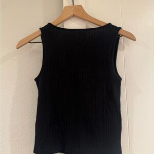 Sleek black tank with ribbed texture. Features button-front detail. Ideal for casual or layered looks.