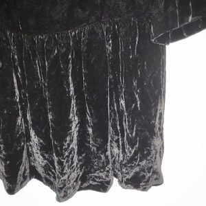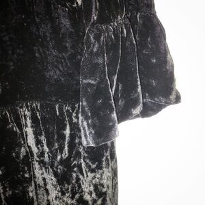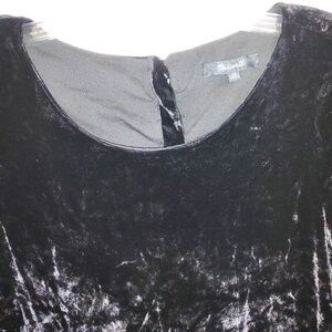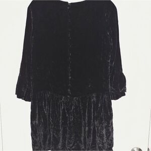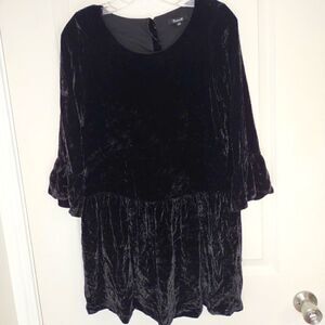 Madewell Black Velvet Dress, Long Bell Sleeves and Scoop Neck. Drop waist full Flare. Velvet Buttons on back for pullover closure. Knee length.