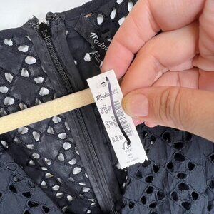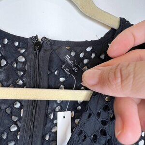This elegant Madewell eyelet maxi dress offers a sophisticated look with its classic black color. The sleeveless design and V-neckline create a timeless silhouette, suitable for formal gatherings or evening events. Crafted from a cotton and viscose blend, it provides a comfortable fit while maintaining style.