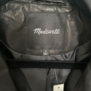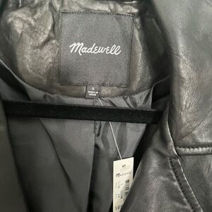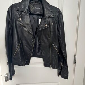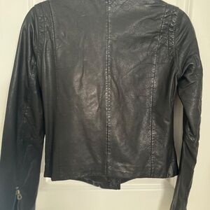 Sleek black leather jacket. Features asymmetrical zipper. Classic biker style.
