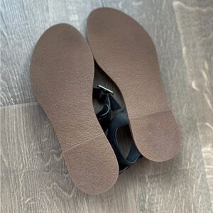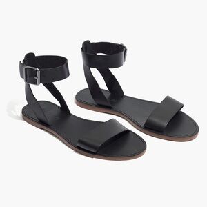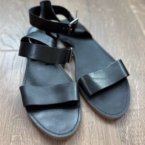Sleek black leather sandals. Ankle strap with buckle. Flat sole for comfort.