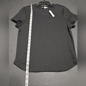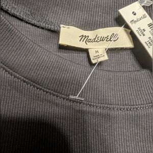 This classic black ribbed top from Madewell features a fitted design with short sleeves, offering a sleek and versatile look. Made from a smooth fabric, it ensures a comfortable fit and a clean finish, making it an essential addition to any wardrobe.