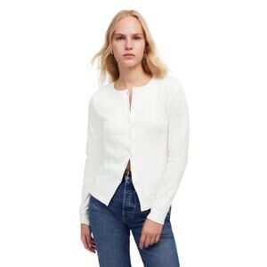 This Madewell ribbed button-front cardigan in classic black is the perfect lightweight layer for year-round wear. The slim silhouette and versatile crew neckline make it easy to style for the office, evenings out, or casual days with denim. A timeless wardrobe essential that works as both a polished layer or a chic standalone top.