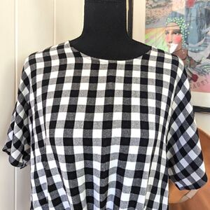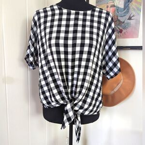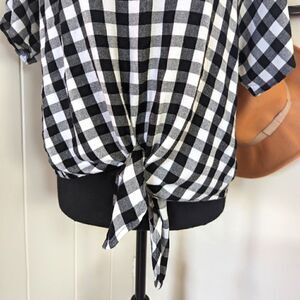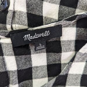 Description: Madewell Black White Buffalo Check Button Back Front Tie Tee sz L EUC, buttons all the way down the back and comes with a spare button, classic black and white buffalo check pattern, drapey shirt that is office-friendly and going out-friendly