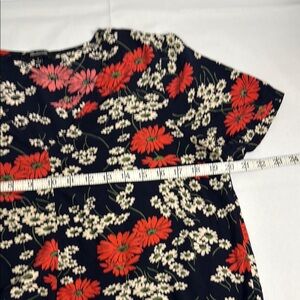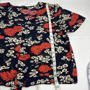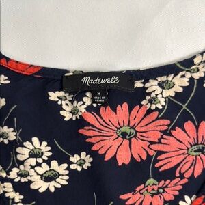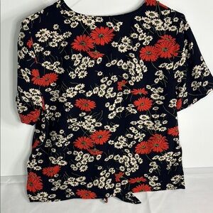 This elegant Madewell blouse showcases a black base with vibrant red floral patterns and subtle white accents. Featuring a charming peter pan collar and a stylish tie front, this short-sleeved top adds a touch of sophistication to any casual ensemble.