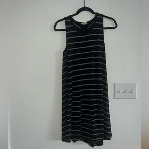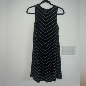 Chic black mini dress with white stripes. Sleeveless design. Perfect for casual outings.