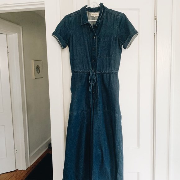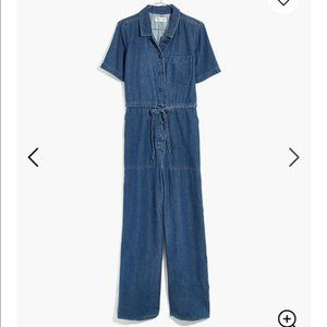 Stylish denim jumpsuit by Madewell. Features short sleeves and button-up front. Perfect for casual outings.