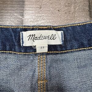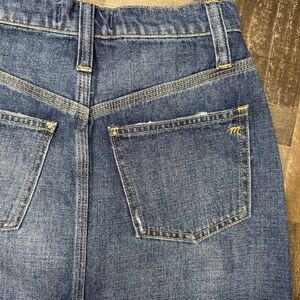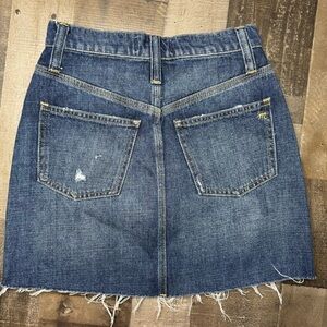 This Madewell mini skirt showcases a classic blue denim color with a raw, frayed hem for a relaxed vibe. Its mini length and casual design make it an ideal choice for everyday outings. The skirt's subtle fading and whiskering add a touch of character to its overall look.