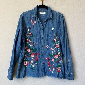 Madewell lightweight blue chambray denim button-down shirt featuring vibrant floral embroidery and raw-cut hem detail. 100% cotton. Excellent, gently worn condition. Size small - 20.5" pit to pit; 24.5" in length.
