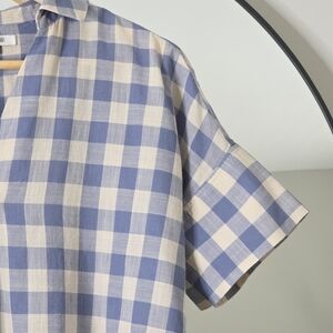 Fresh, easy, and effortlessly cute. This Madewell short-sleeve blouse features a soft blue and cream gingham pattern, a flattering V-notch neckline, and subtle front pleats. The standout detail? A button-down back that adds charm and structure to this breezy style.