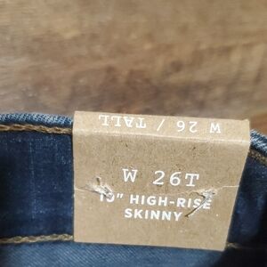 These Madewell jeans offer a sleek skinny silhouette in a classic blue shade, featuring a comfortable stretch and a flattering tapered leg. Ideal for versatile styling, they maintain a polished appearance with their consistent color and smooth fabric.