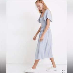 Elegant midi dress with a square neckline. Features short flutter sleeves. Light blue and white stripes. Perfect for casual outings.