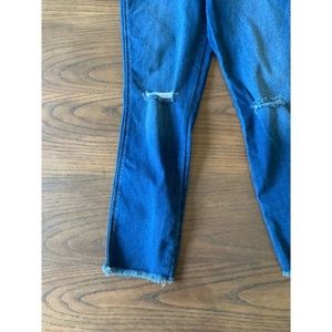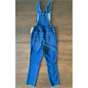 Stylish denim overalls. Features adjustable straps. Distressed knee details. Perfect for casual wear.