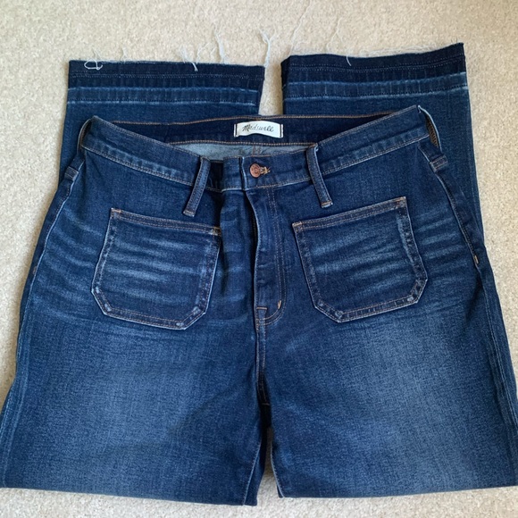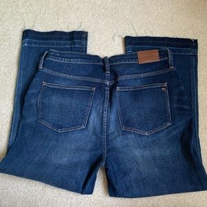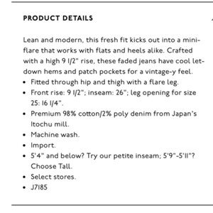 Lean and modern, this fresh fit kicks out into a mini-flare that works with flats and heels alike. Crafted with a high 9 1/2" rise, these faded jeans have cool let-down hems and patch pockets for a vintage-y feel.