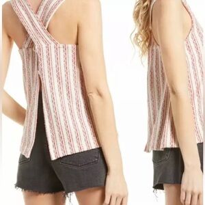 NWT! Cute, casual tank. Made of textural bouclé knit, this striped tank is simple in front and fancy in back with crisscross straps, delicate buttons and a skin-baring slit hem.