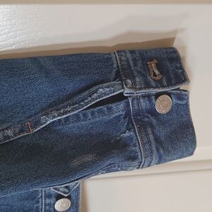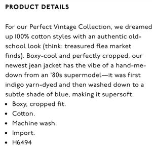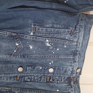 The perfect throw-back jean jacket. This is the paint splatter version of Madewell's 5 star rated, most popular jean jacket--the Boxy Crop. (I couldn't have splattered it better myself.) Perfect weight, perfect color, perfect length, etc etc etc. 20" shoulder to hem, 20" sleeve length, 17" underarm to underarm