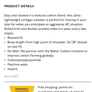 Flawless oversized (could easily fit a sz small, see measurements) lightweight cotton blend cardigan. Perfect for throwing on over any outfit, or stashing in a bag just in case. Manufacturer description in pix. No flaws.
