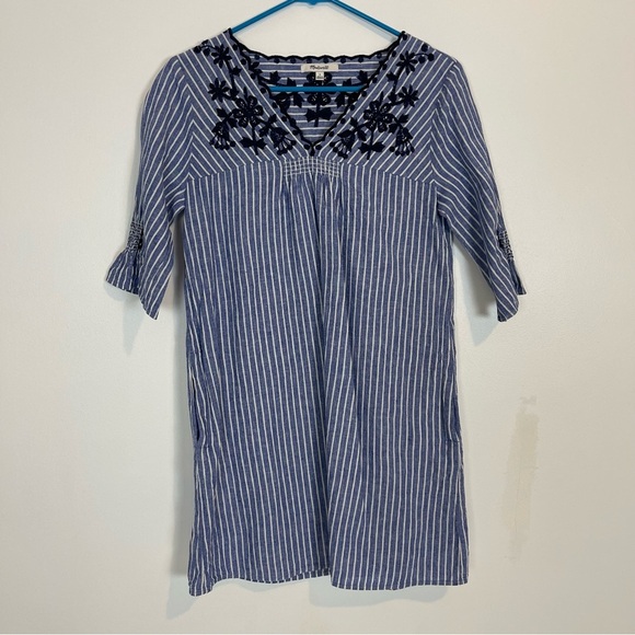 Madewell Breeze Embroidered Shift Dress v neck striped 2/3 sleeve pocket size S