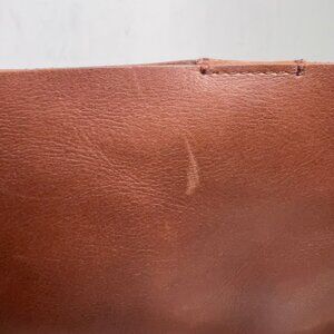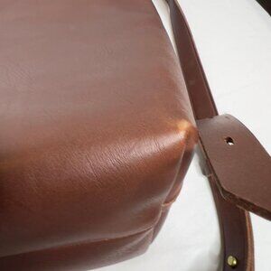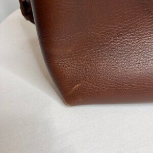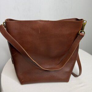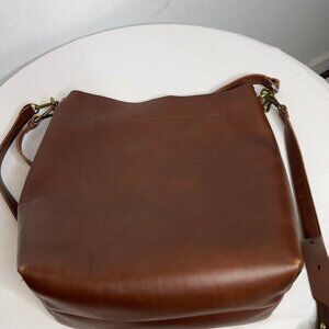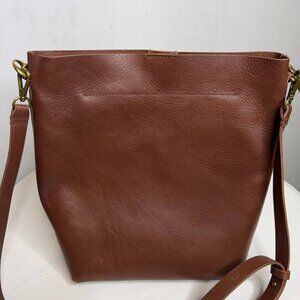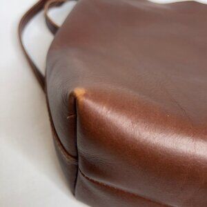 Stylish brown leather bucket bag. Features adjustable strap. Perfect for everyday use.