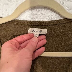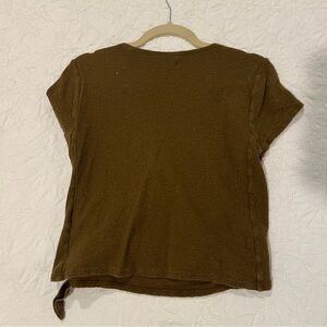 Elegant brown wrap blouse with a textured finish. Features a stylish side tie. Ideal for versatile styling.