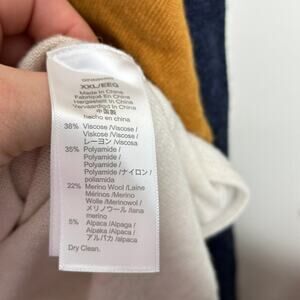 Stylish colorblock design. Features brown, cream, and black sections. Cozy turtleneck style.