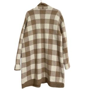 Cozy plaid cardigan. Open front design. Features pockets. Perfect for layering.