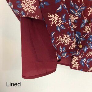 A charming floral style with a V-neck and silver buttons all the way down the back. The kind of versatile work-to-party dress that looks as good with sneakers as it does with platform boots. Cuffed long sleeves. Relaxed fit; the waist is not emphasized. Fully lined. Beautiful color combination - burgundy, blue and off-white.