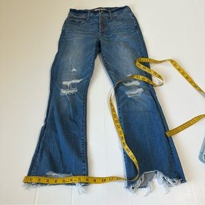 Madewell Cali Demi Boot Jeans in Bronson Wash Button Front Edition in size 26. Features a blue wash with factory fading, whispering, grinding , distress, distressed knees, intentionally asymmetrical hems with distress and fraying, and exposed button front fly. Made from 88% cotton, 8% polyester, and 4% elastane. These do have stretch to them. Please see measurements in photos. In overall very good used condition. Please look at all photos and ask if you have any questions.