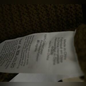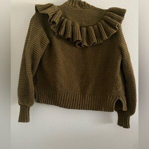 Stylish olive green knit cardigan with ruffled collar. Features two front pockets and ribbed cuffs. In great condition 19 inches armpit to armpit 18 inch length thick cotton material