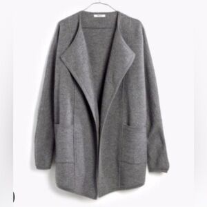 This Madewell cardigan in a soft gray hue offers a cozy, oversized fit with a minimalist design. Its open front and draped collar make it a versatile piece for casual wear, while the soft knit texture ensures comfort and style.