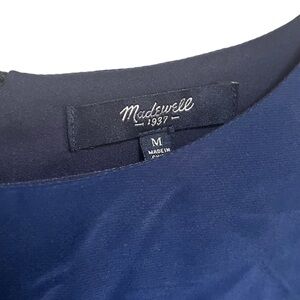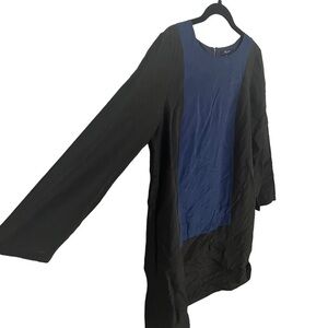 Madewell Centerpiece Silk Jersey Dress. Navy blue and black color block shift dress. Hidden slip side pockets. Lined. Long sleeve. Zipper at back of neck. Loose fit. Length hits at mid-thigh.