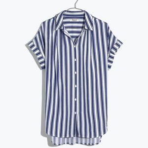 Madewell's central shirt in white and navy stripe. This cut is a Madewell classic! Look is a tad oversized so the fit is fuller than a traditional button up. Great for work or play.