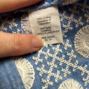 Chambray fabric with white embroidered neckline , sleeves, shoulders, pockets & hem
