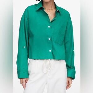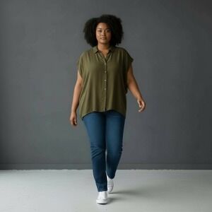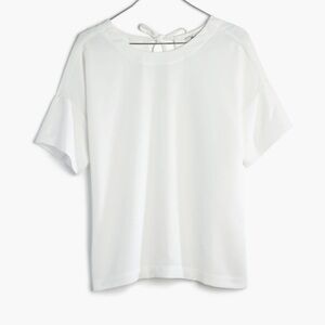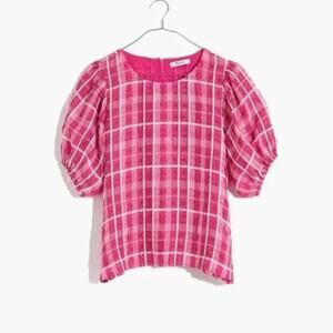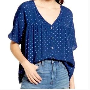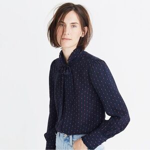 Madewell Yarn Dyed Indigo Chambray Long Easy To Roll Sleeve Round Neck Ruffled Yoke Bib Details Front Button Comfy Casual Contemporary Cottagecore Prairie Blouse