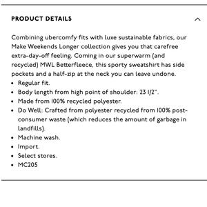 Coming in our superwarm (and recycled) MWL Betterfleece, this sporty sweatshirt has side pockets and a half-zip at the neck you can leave undone.Regular fit. Body length from high point of shoulder: 23 1/2".Made from 100% recycled polyester.Do Well: Crafted from polyester recycled from 100% post-consumer waste