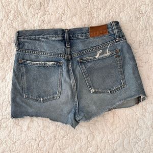 Madewell Classic Straight jean cut offs with whiskering and distressed details at pockets.