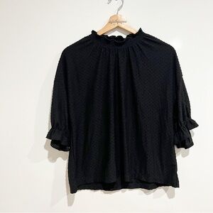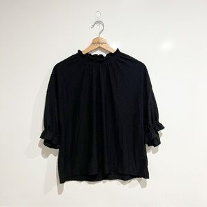 Comfy and lightweight with a cool allover clipdot effect, this wear-everywhere top has a high smocked neckline, elbow-length sleeves and feminine ruffled details. Tuck it into high-waisted jeans for a vintage-meets-modern look.