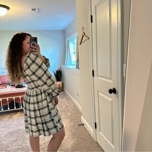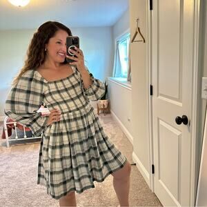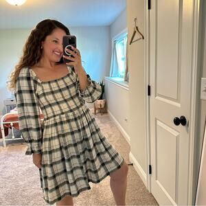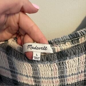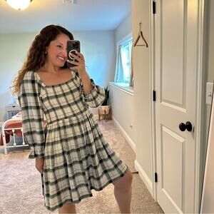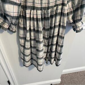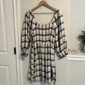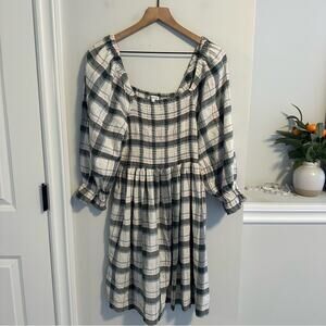 I adore this super pretty Madewell cotton white black plaid cotton smocked square neckline long sleeve mini dress