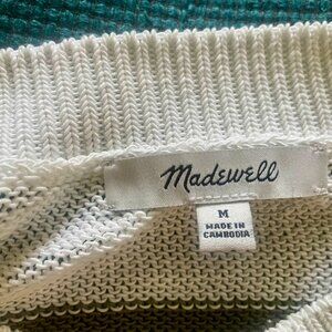 Loose knit crewneck Madewell Sweater in a cotton blend is the perfect transitional layer. Size medium in an olive green and white stripe. Perfect for evening walks on the beach!
