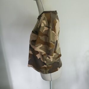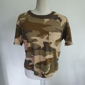 Madewell "Cottontail Camo" slightly cropped tee shirt with bunnies leaping in the camo print! Front pocket.